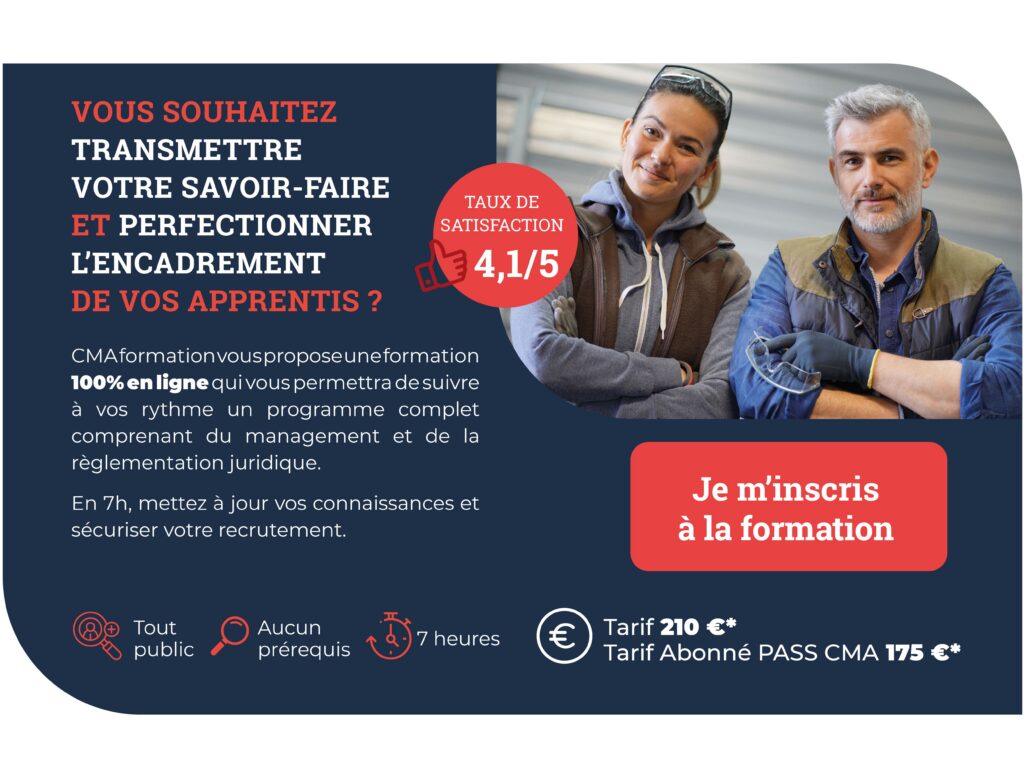 Une formation en ligne tutorée de 7 heures : « Maître d’apprentissage en entreprise artisanale TPE/PME » Accessible 7j/7 et 24h/24 selon vos disponibilités.